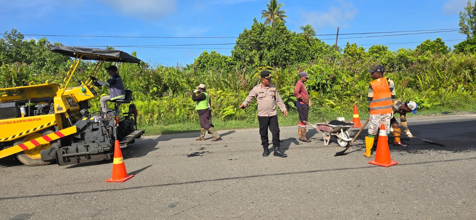 Sarmi – Ciptakan keamanan dan keselamatan pekerja pengaspalan satuan binmas melalui KBO Binmas Ipda Syarifuddin ,S.Sos memberikan himbauan kepada mandor dan pekerja pengaspalan yang berada di jalan base camp tentang pentingnya keselamatan para pekerja maupun pengendara lain yang sedang melewati jalan tersebut . Kamis 19/02/2026.